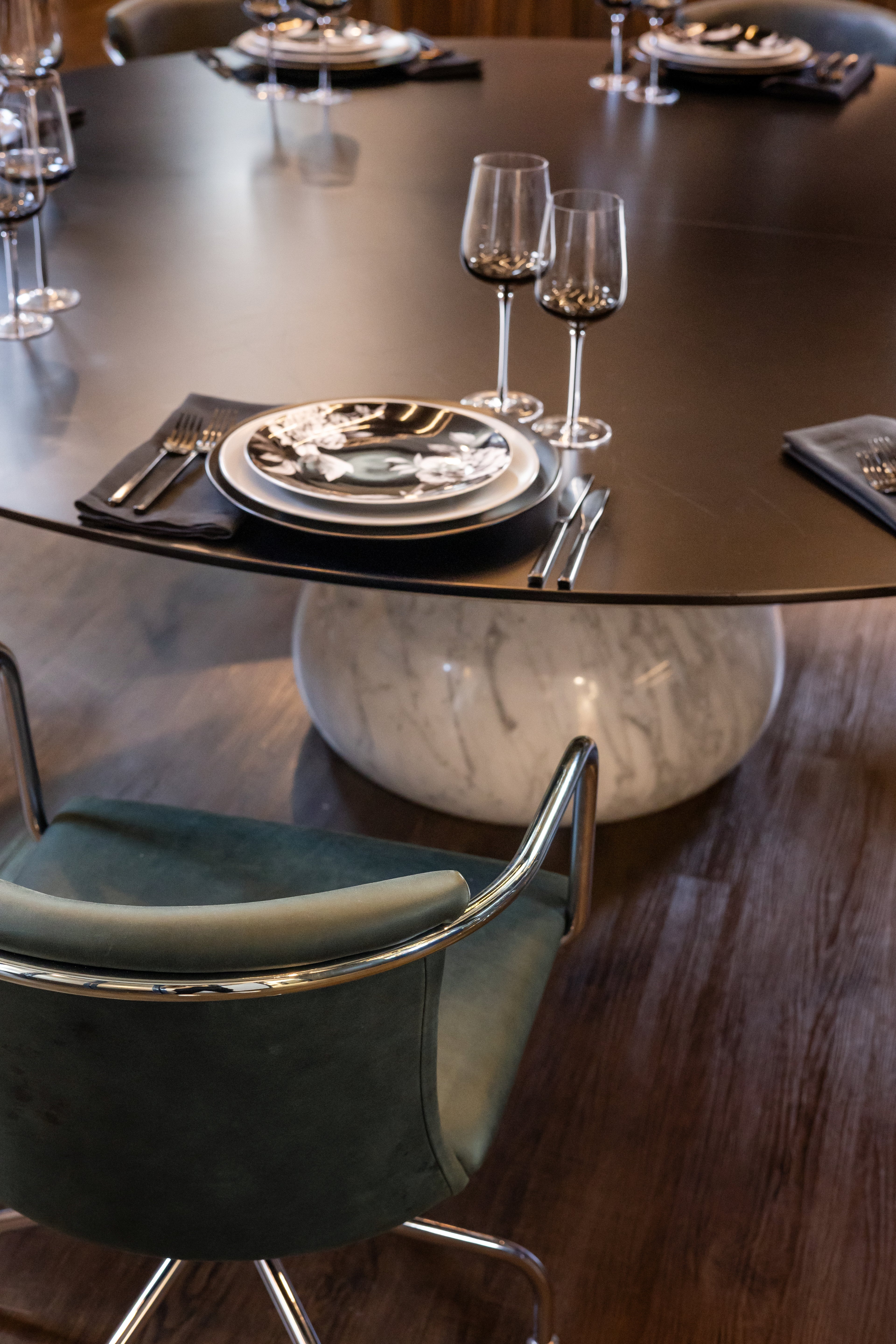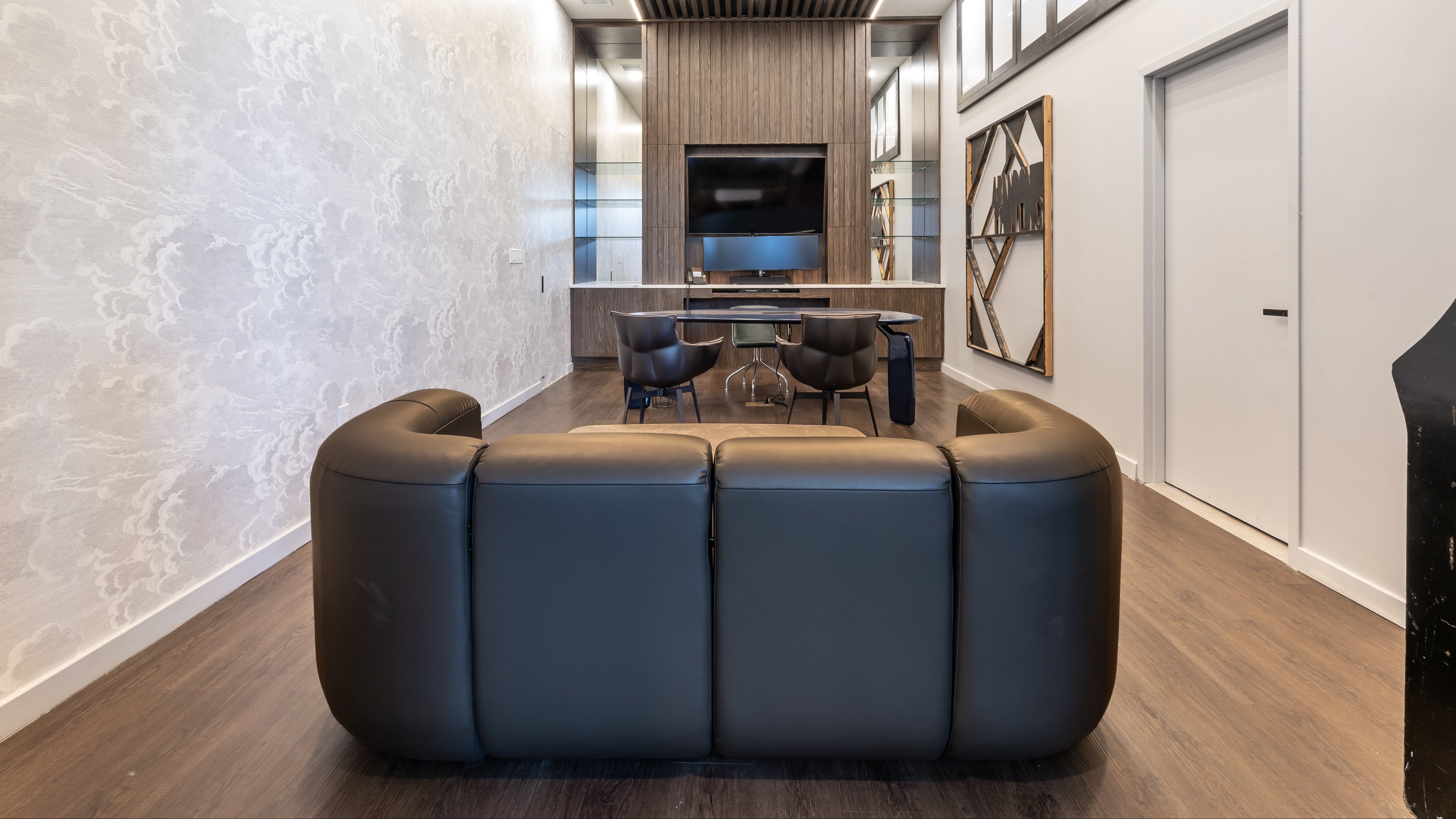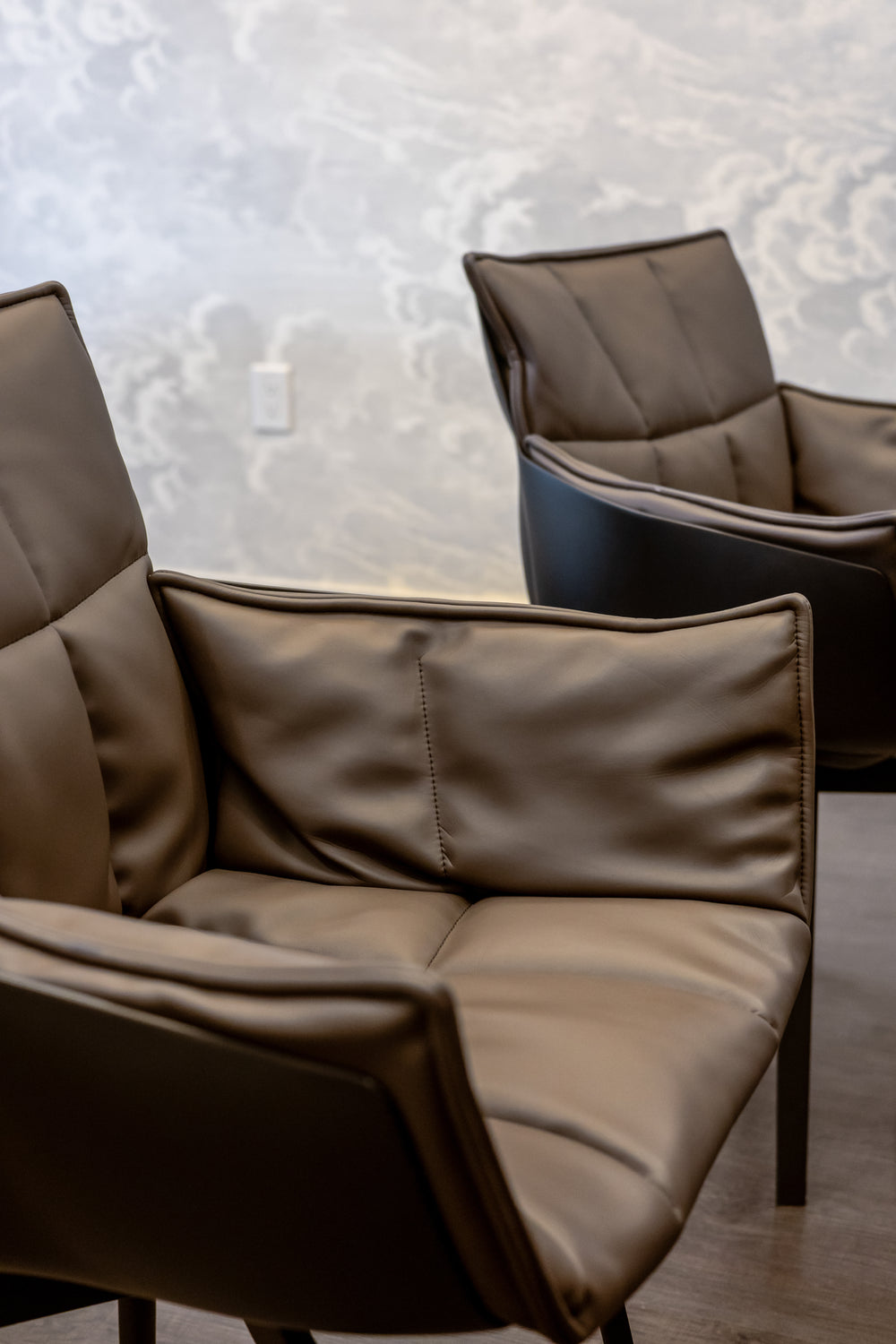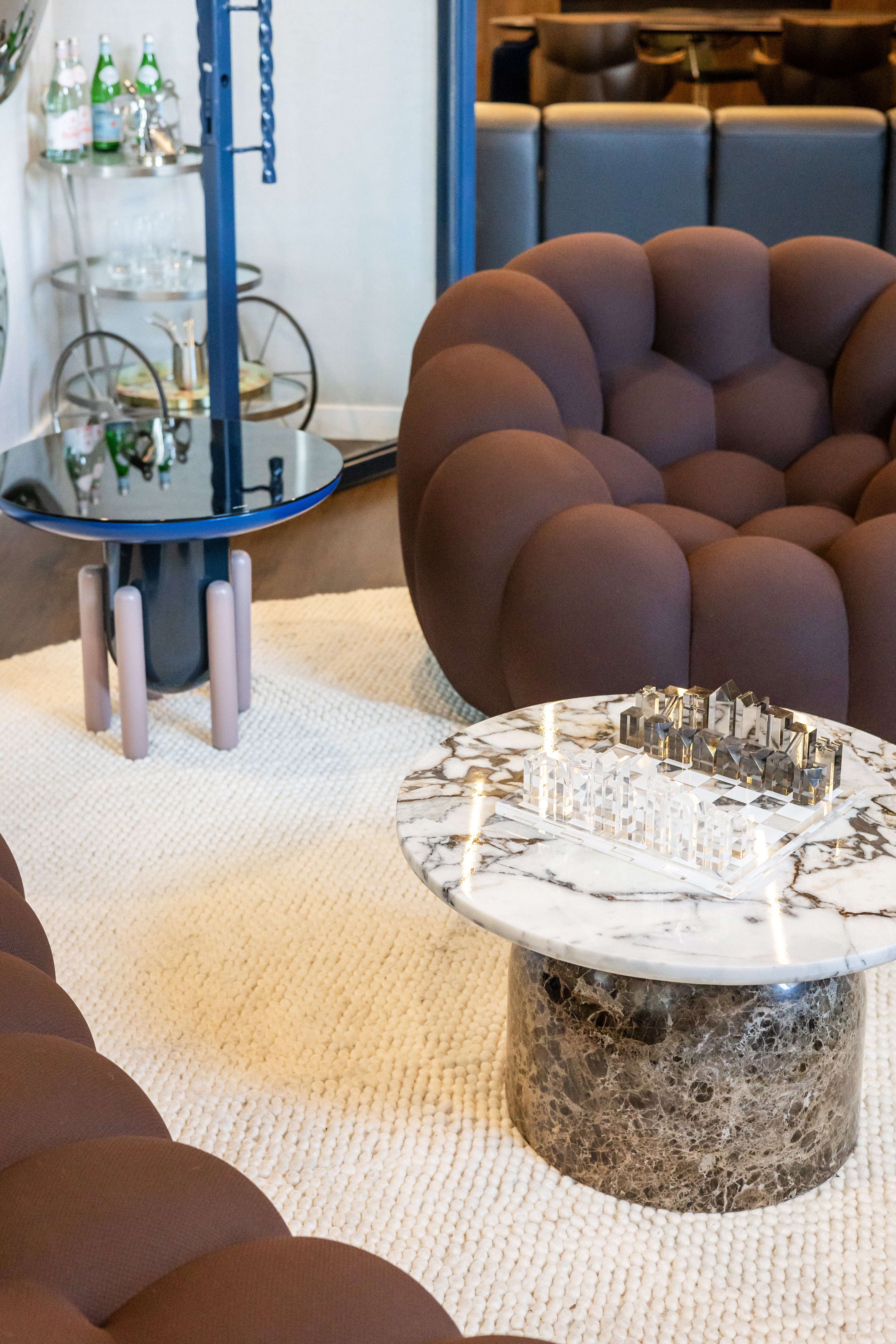 For this project, we curated a palette of materials that combine richness with refinement. The mix of natural stone, luxurious leather, and bold fabric textures brings depth and character to the space. Each element was chosen to balance warmth with a contemporary edge, creating an interior that feels both inviting and distinctive.