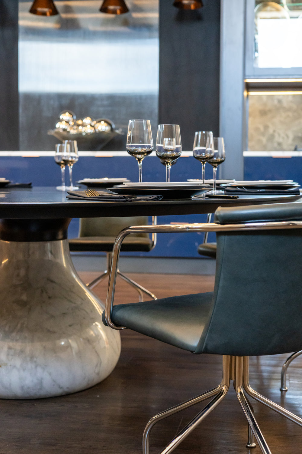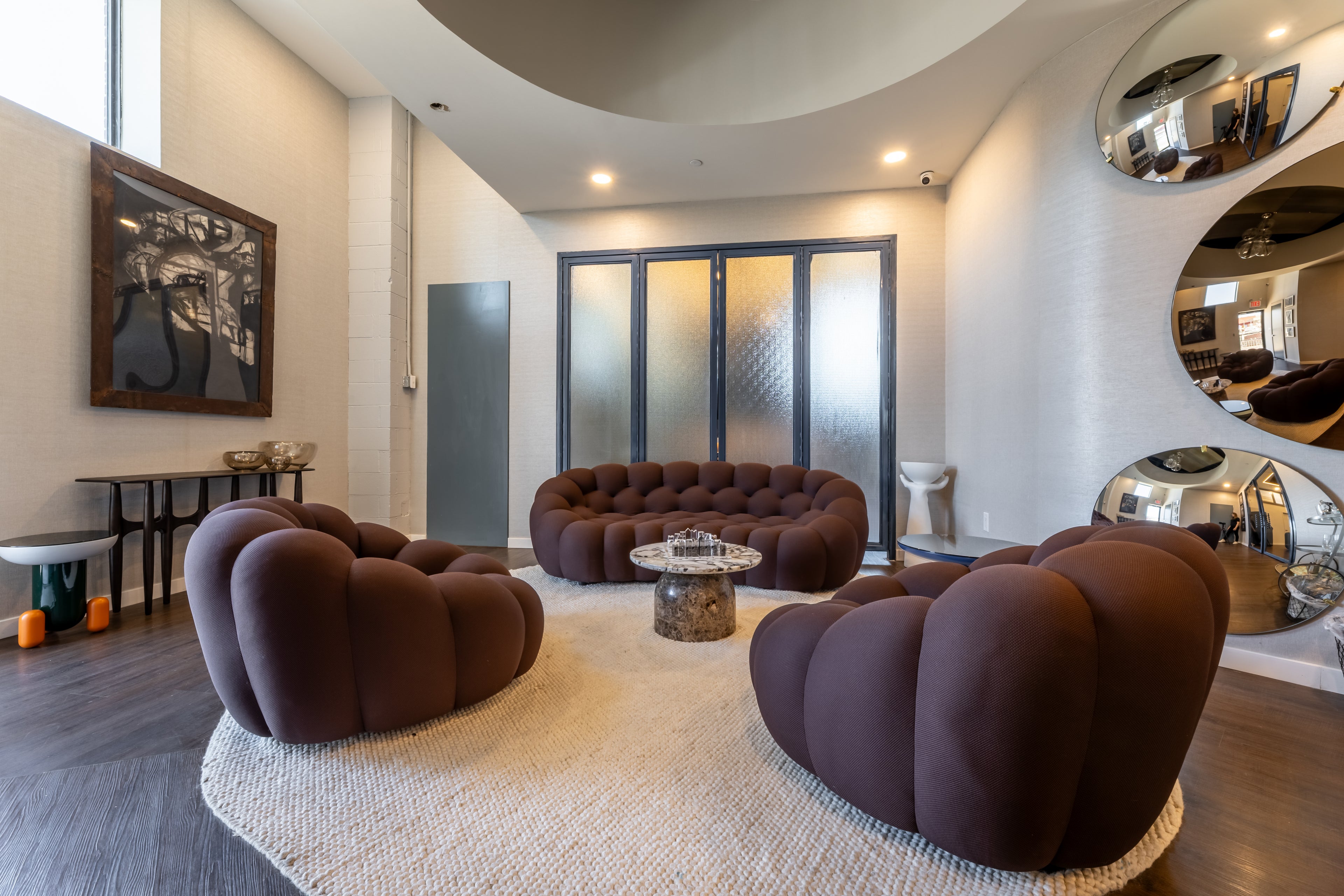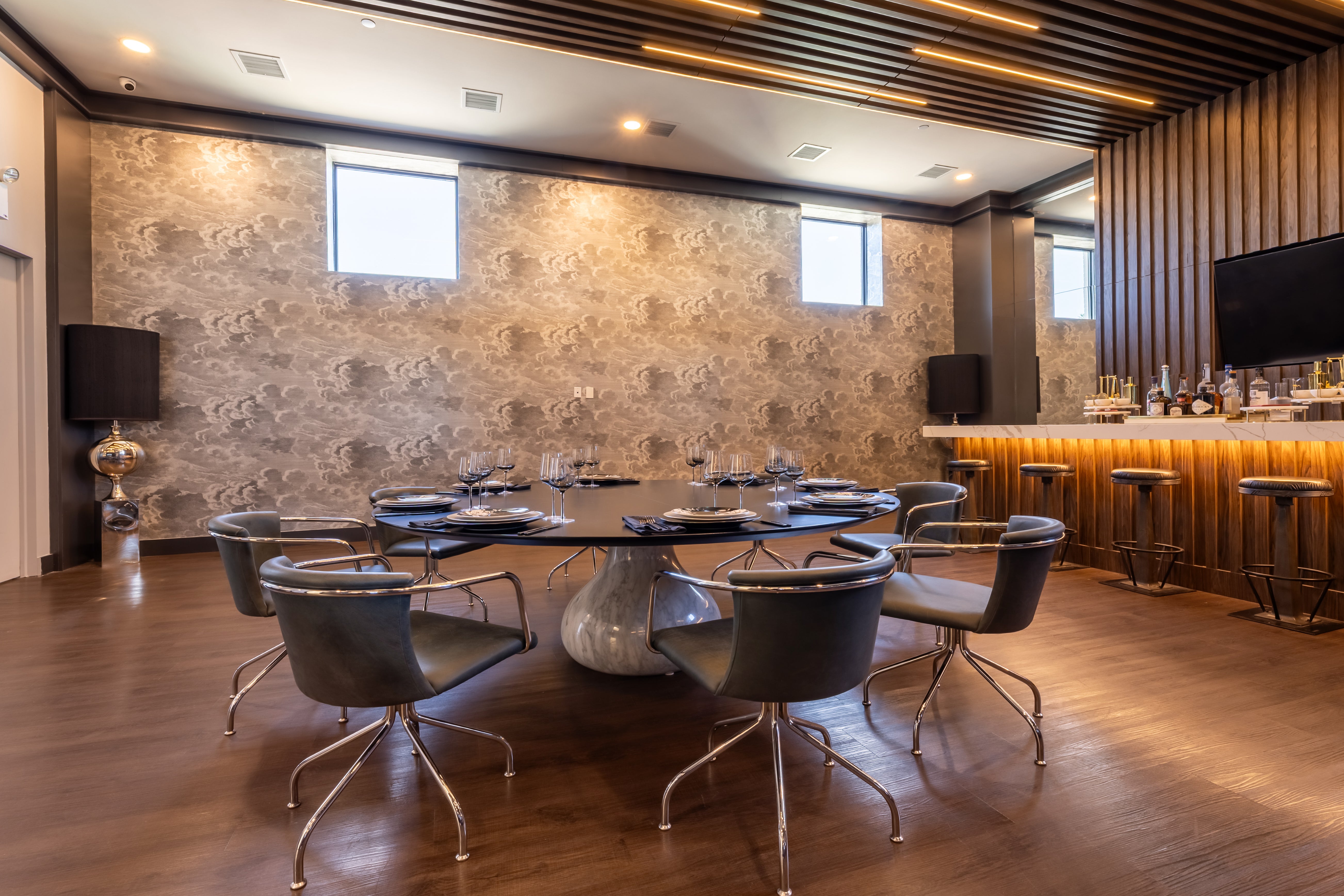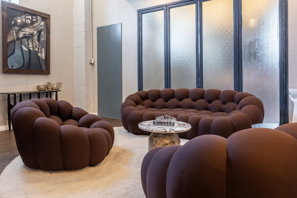 For this project, we curated a palette of materials that combine richness with refinement. The mix of natural stone, luxurious leather, and bold fabric textures brings depth and character to the space. Each element was chosen to balance warmth with a contemporary edge, creating an interior that feels both inviting and distinctive.